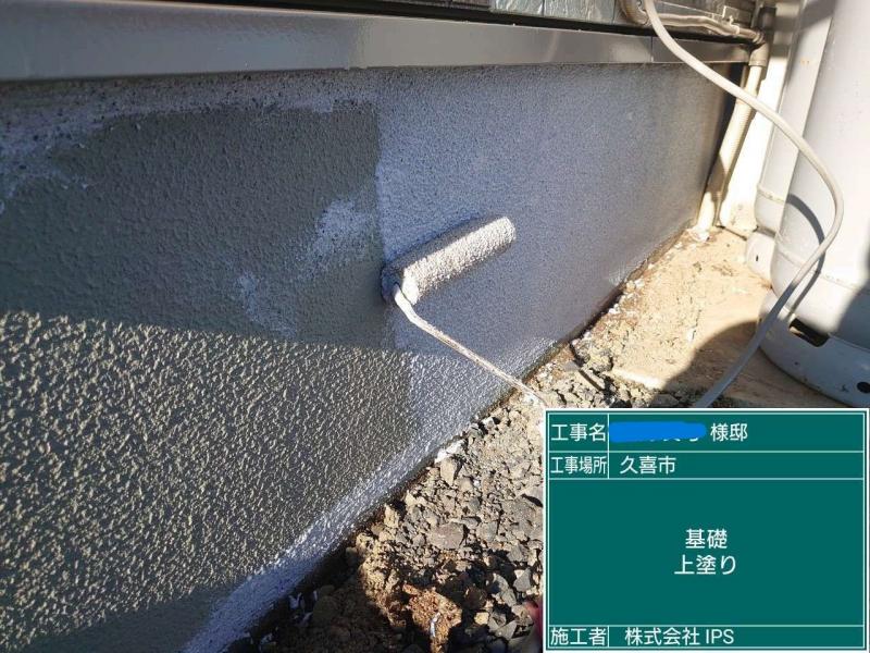 基礎は最初コンクリートがむき出しの状態でした。全体が綺麗になると基礎の汚れなどが目立ってくるので、併せて塗装をおすすめしています。一般的な塗料で塗装するとすぐに剥がれてきてしまいますので、基礎専用の塗料を使用しています。