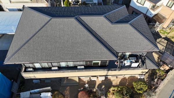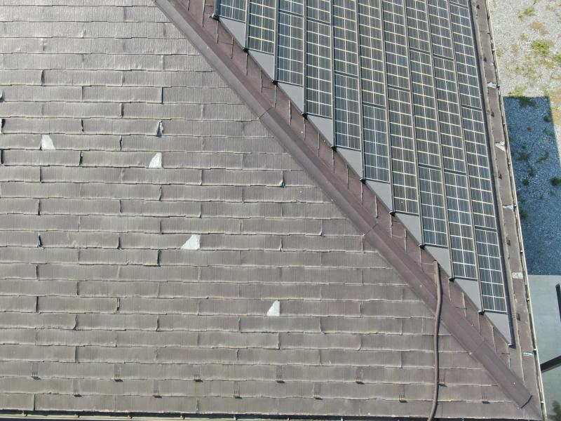 屋根がパミールでぽろぽろと落下することからお隣へ迷惑をかけてしまっているとご相談を受けました。お家自体がとても大きいのと太陽光パネルが設置されており脱着を含むと金額がかなりかかってしまい悩まれていました。太陽光パネルは設置から20年以上経っており、これを機に撤去(戻しなし)また屋根材をアスファルトシングル材のものへすることで費用を抑えることができます。