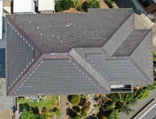 既存屋根材はスレートでパミールという製品です。パラパラと屋根がめくれ上がるのが特徴で塗装は困難です。白くなっているのは剥がれてしまっている部分です。