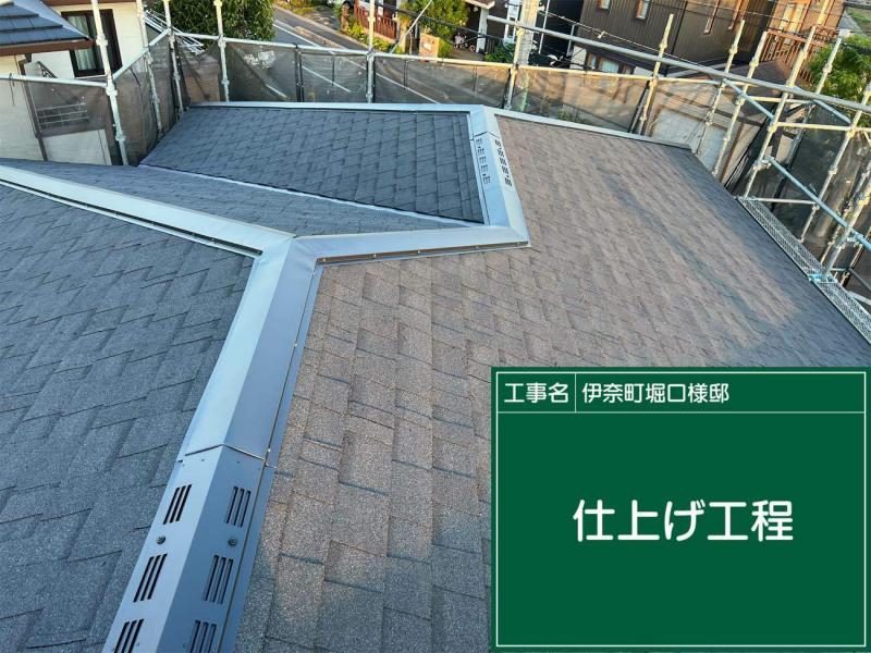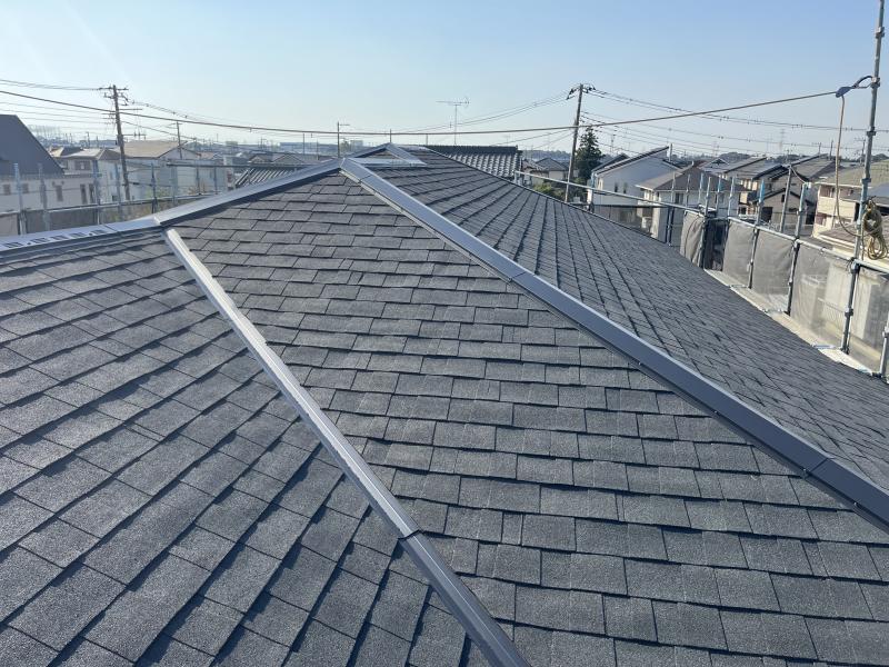 最後に棟板金を取り付けて完成です。棟は屋根材と同じシングル材質のものにすることも可能です。見た目の違いで機能に違いはありません。