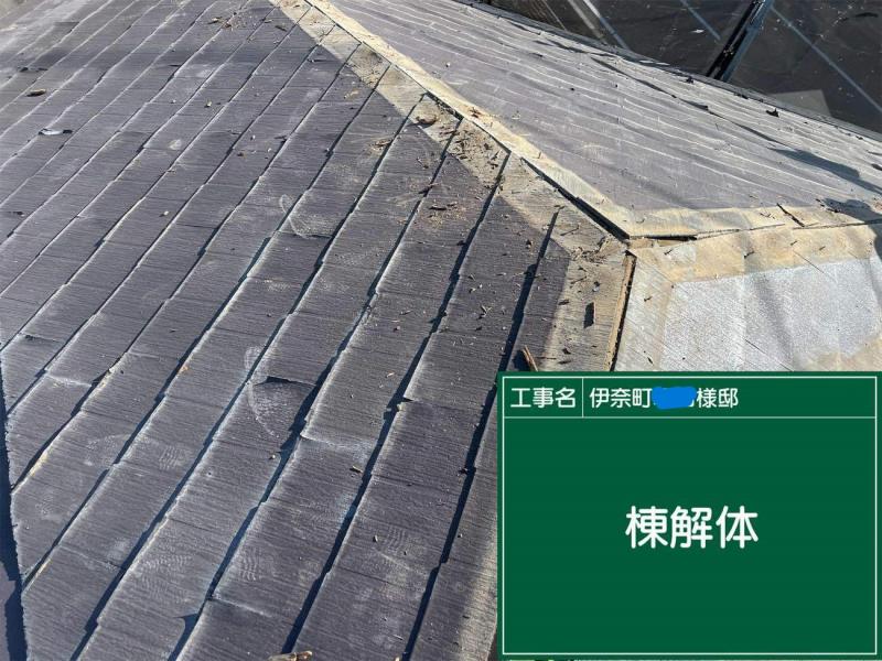 新しい屋根をかぶせるにあたり、既存の棟板金を撤去します。