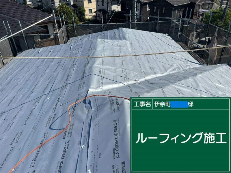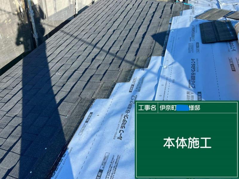 本体を張っていきます。カバー工法でよく用いられるのが金属ですが、どうしても金属の方が高額になってしまいます。かと言って今回使用するシングル材は悪いものではありません。軽量で柔軟性が高く、セラミックコーティングにより耐候性もあります。少しでも費用を抑えたいという方はこちらの屋根がおすすめです。逆にメンテナンスフリーにしたい、ガルバの屋根にしたい等高耐候な屋根を求める方には、アイジー工業のスーパーガルテクトやデクラのセネターがおすすめです。