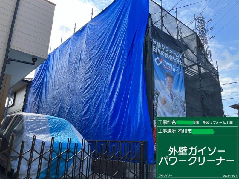 洗浄をする際、ご近隣と近い場合は写真のように水が飛ばないように、ブルーシートをかけます。お車がある場合は許可をとり車にシートを欠けさせて頂きます。