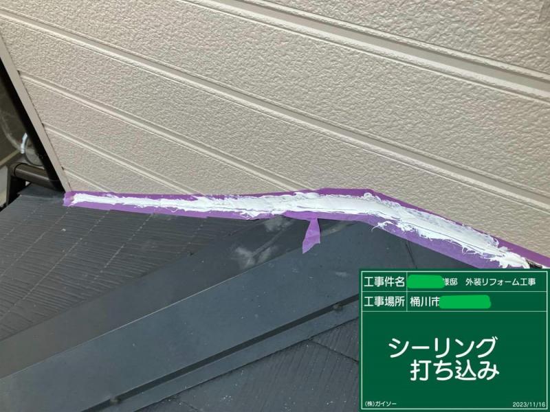 既存で屋根と外壁の隙間にシーリングが打たれていましたので、新たにシーリングし直しました。