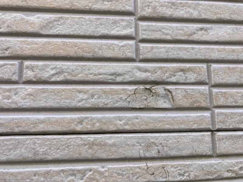 サイディングは釘で打ち付けられており、その釘頭周りのひび割れが少し目立っておりました。着色塗料で塗装する場合は塗りつぶされますので大丈夫ですが、クリア塗装の場合は細かいひび割れの跡や補修跡が残ります。