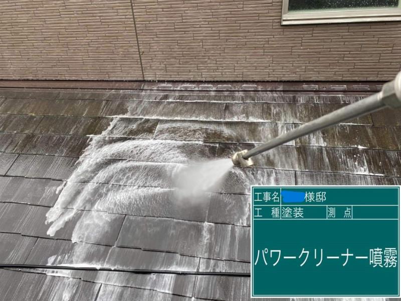 初めに軽く高圧洗浄をして水養生をしたあと、バイオ洗浄剤入りの水を噴霧して外壁や屋根に付着した汚れを根元から浮かせます。