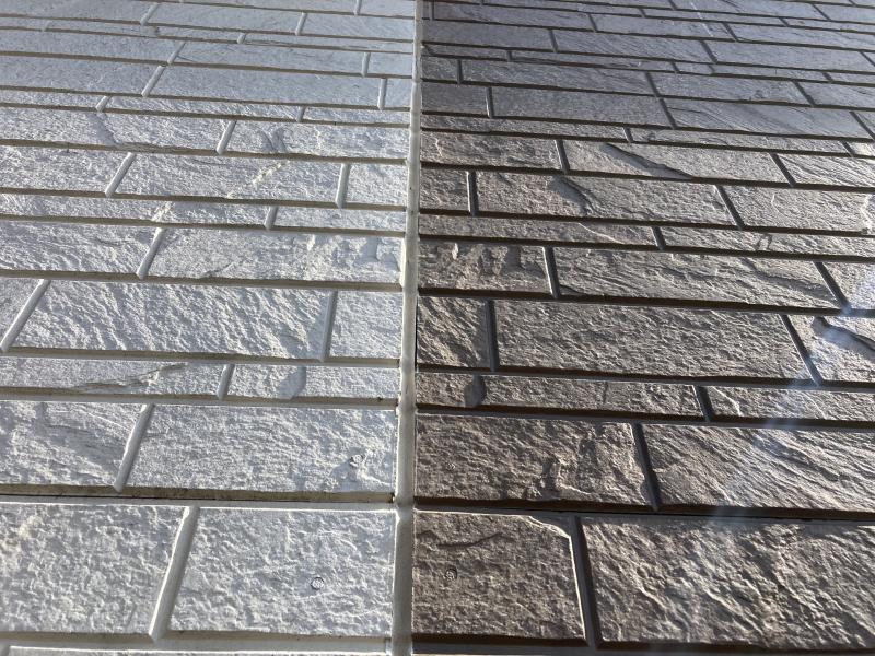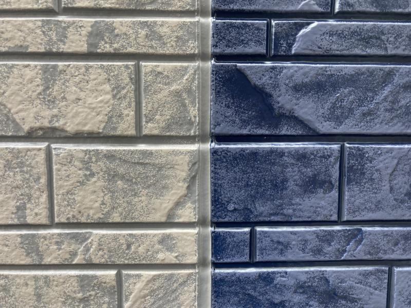さらに中塗りと上塗りの色を少し変え模様仕上げにしました。サイディングのデザインによってできる工法ですので、こういったタイル調を生かすならぜひガイソー上尾店にご相談ください。凹凸によって同じ色を使用しても全く違う仕上がりになりますので、ご希望の色をお伺いしお客様の外壁のデザインに近い過去の事例をご紹介でき、実際に施工した現場の案内も可能です。