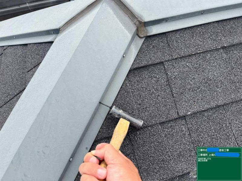 棟板金の取り合いのシーリングのやり直しと、釘が浮いていないかの確認をします。現場調査時にドローンである程度確認できますが、足場を架けて実際に見てみないと分からない部分もあります。釘がほぼ抜けてしまっている部分は撤去しビス留めをします。少し浮いている程度でしたら戻して釘頭をシーリングでとめます。