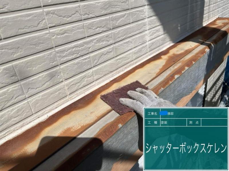 今回シャッターboxの錆が顕著に現れておりました。錆が進行すると穴が空き雨漏りすることがありますので、これ以上錆びないように錆止めを入れてから塗装します。