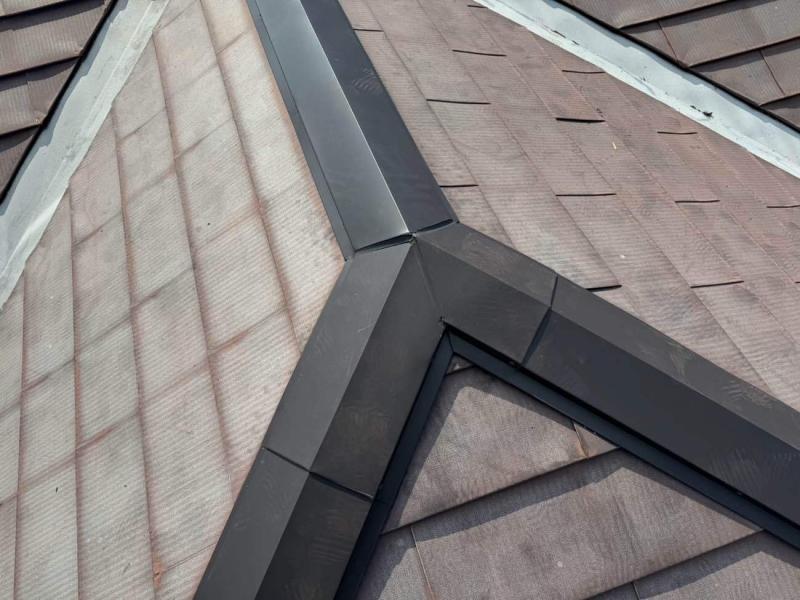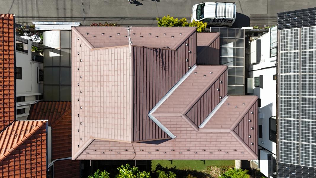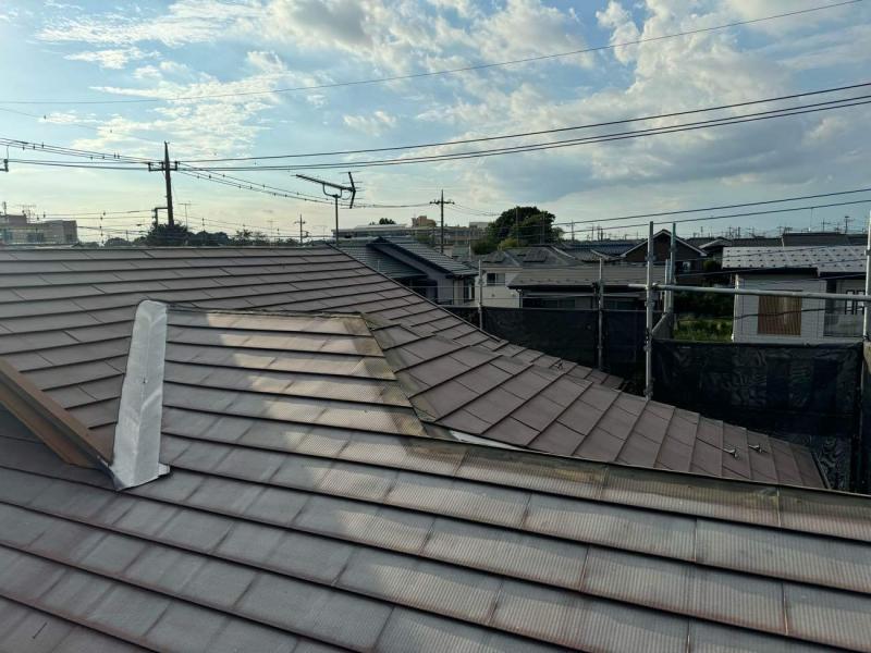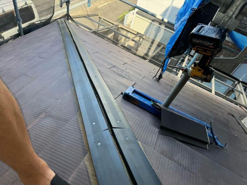 今回は全体的に釘浮きが見られ、築年数も32年経過していますので、中の下地も痛んでいるのではないかと考え塗装と併せて棟板金の交換を行いました。また新しくした棟板金交換の下地には腐食しずらい樹脂タイプを採用し、留め付けにはステンレスビスを使用。ステンレスビスは釘よりも錆びにくく、高い耐久性を持っているため、再び緩むリスクを大幅に軽減します。特に棟板金の固定には適しており、強風や台風など自然災害にも強くなるため、長期的に安定した屋根の状態を保つことができます。一度の修理で、将来的なメンテナンス回数を減らすことができる点でも、棟板金交換の際は釘ではなくステンレスビスが必須です。