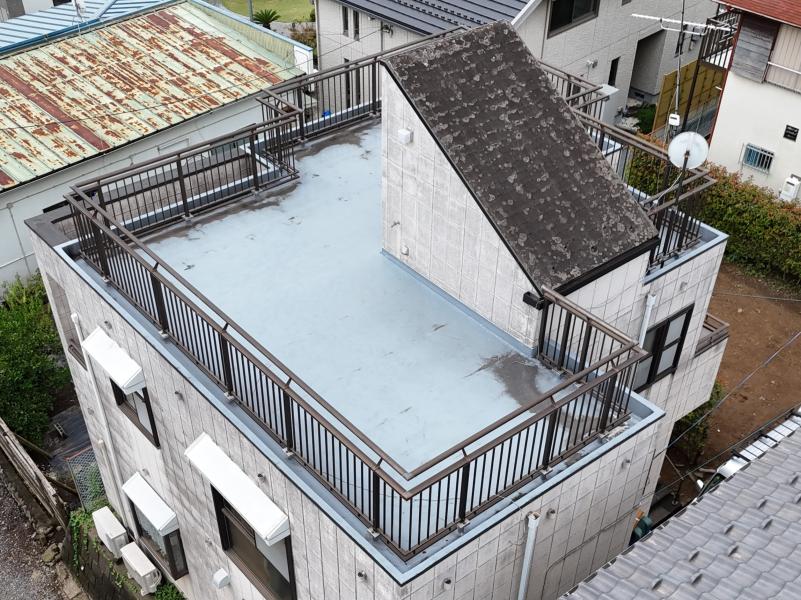 屋上の防水が切れている部分が数カ所あることが雨漏りの原因でしたのでウレタン防水通気緩衝工法にて防水工事のやり直しを行いました。