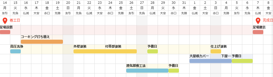 雨が降ると業できず、日程がずれることがありますが、少し予備日を設けておりますので基本的には予定通り終了します。
