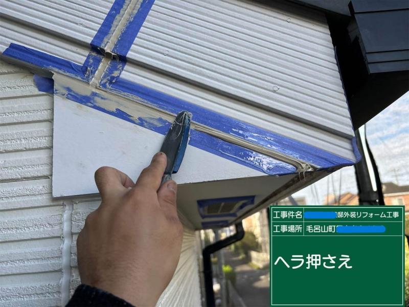 破風板(はふいた)は、屋根の先端部分に取り付けられた重要な建材です。主に雨風を防ぎ、屋根裏に水分や風が侵入するのを防ぐ役割を果たしています。また、破風板があることで建物の外観が整い、デザイン性を向上させる効果もあります。つなぎ目のシーリングが劣化していましたので新しいシーリングで補修しています。