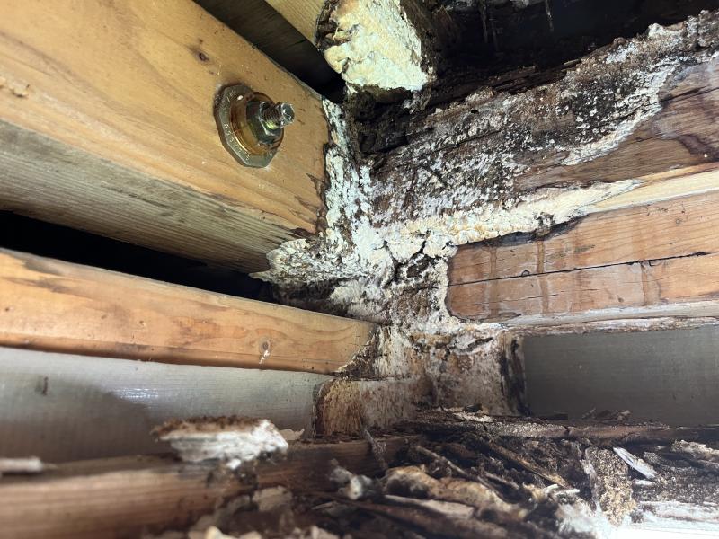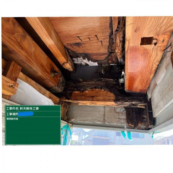 バルコニーしたの軒天を剥がすと中まで雨水が浸入し、木材が腐食し菌も繁殖していました。